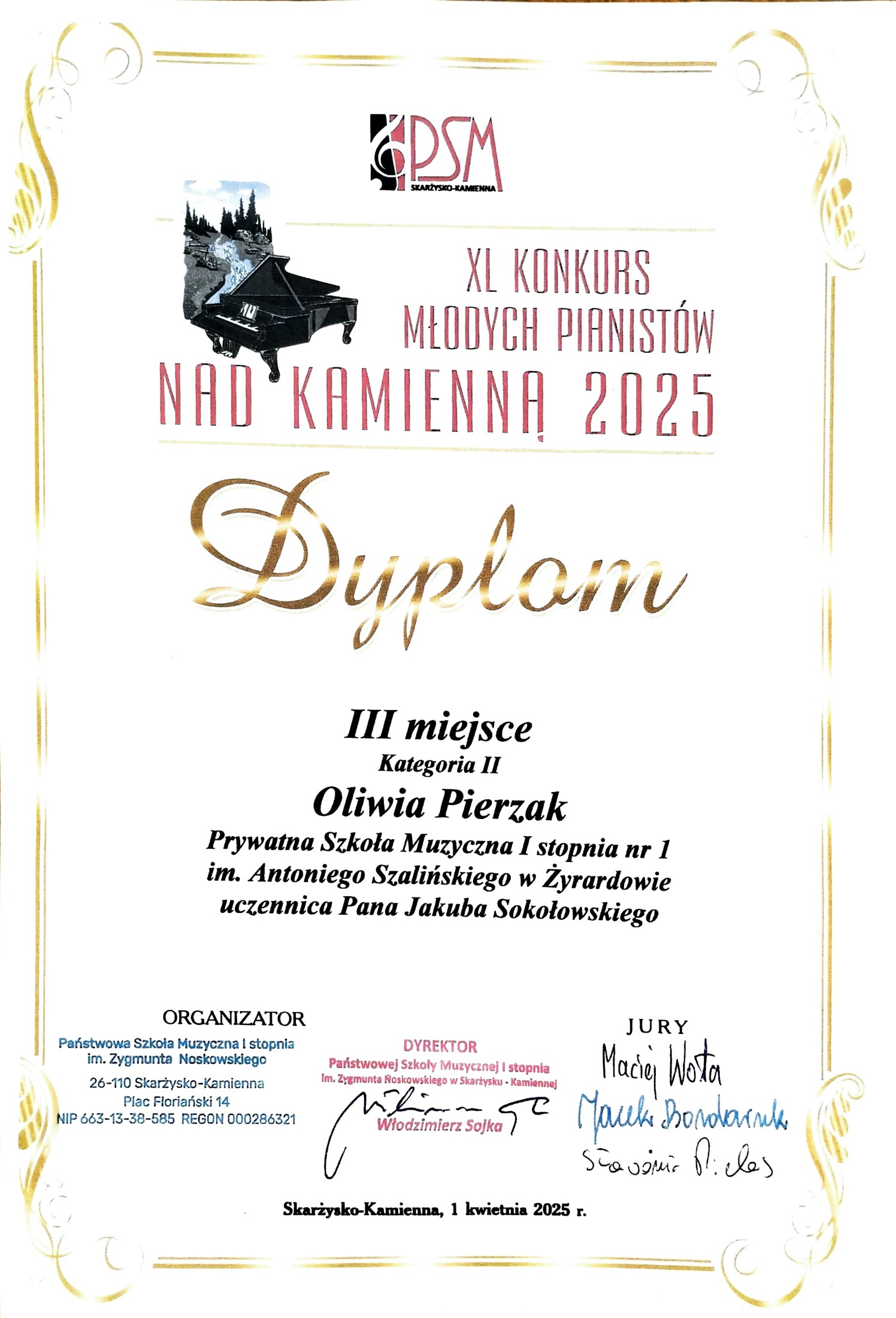 Opublikowane w 2 kwietnia 20259 kwietnia 2026 przez TomekSukces naszej uczennicy – galeria. Z radością dzielimy się sukcesem naszej uczennicy! Oliwia zdobyła III miejsce w XL Konkursie Młodych Pianistów nad Kamienną. Gratulujemy!!! Serdecznie dziękujemy panu Jakubowi Sokołowskiemu za przygotowanie i wspieranie uczennicy