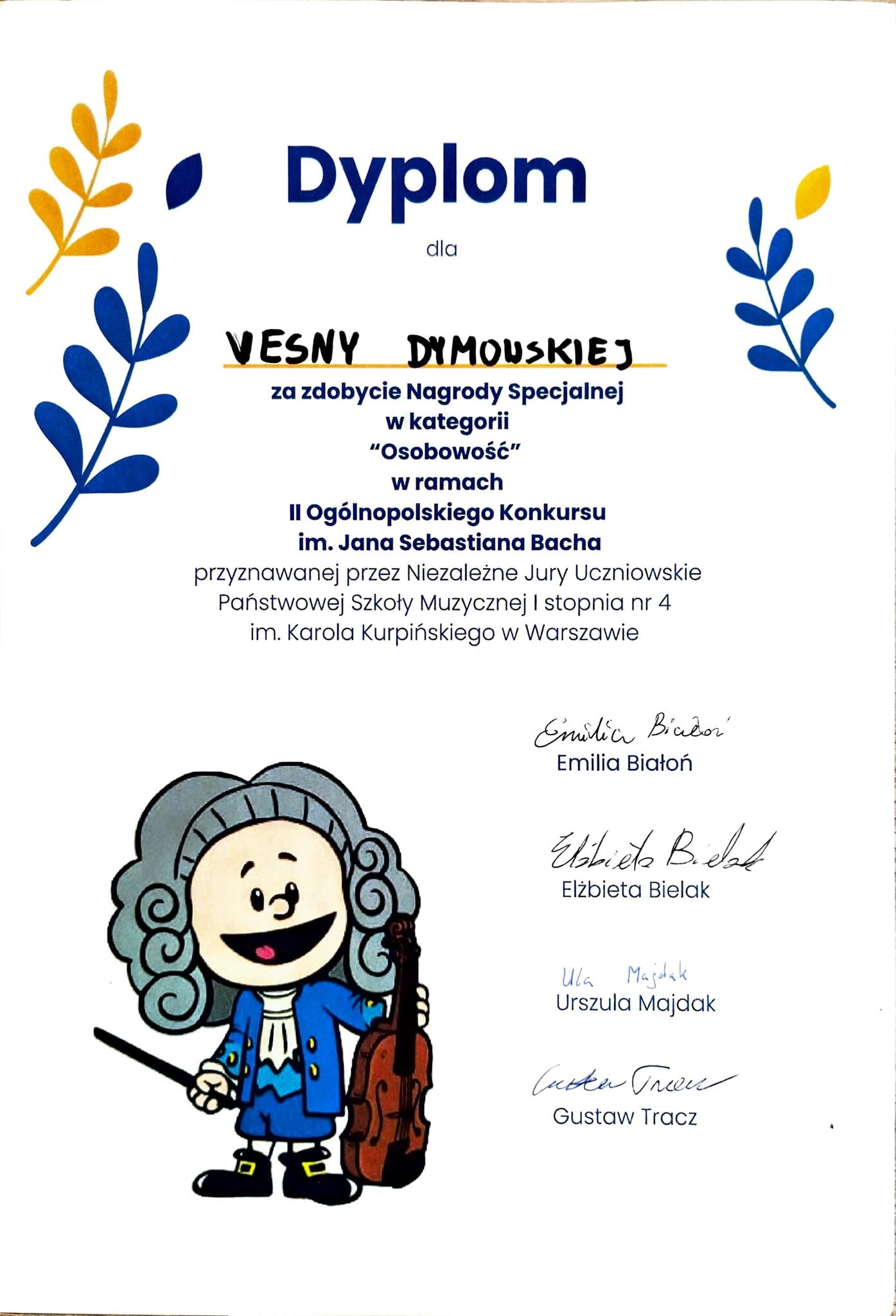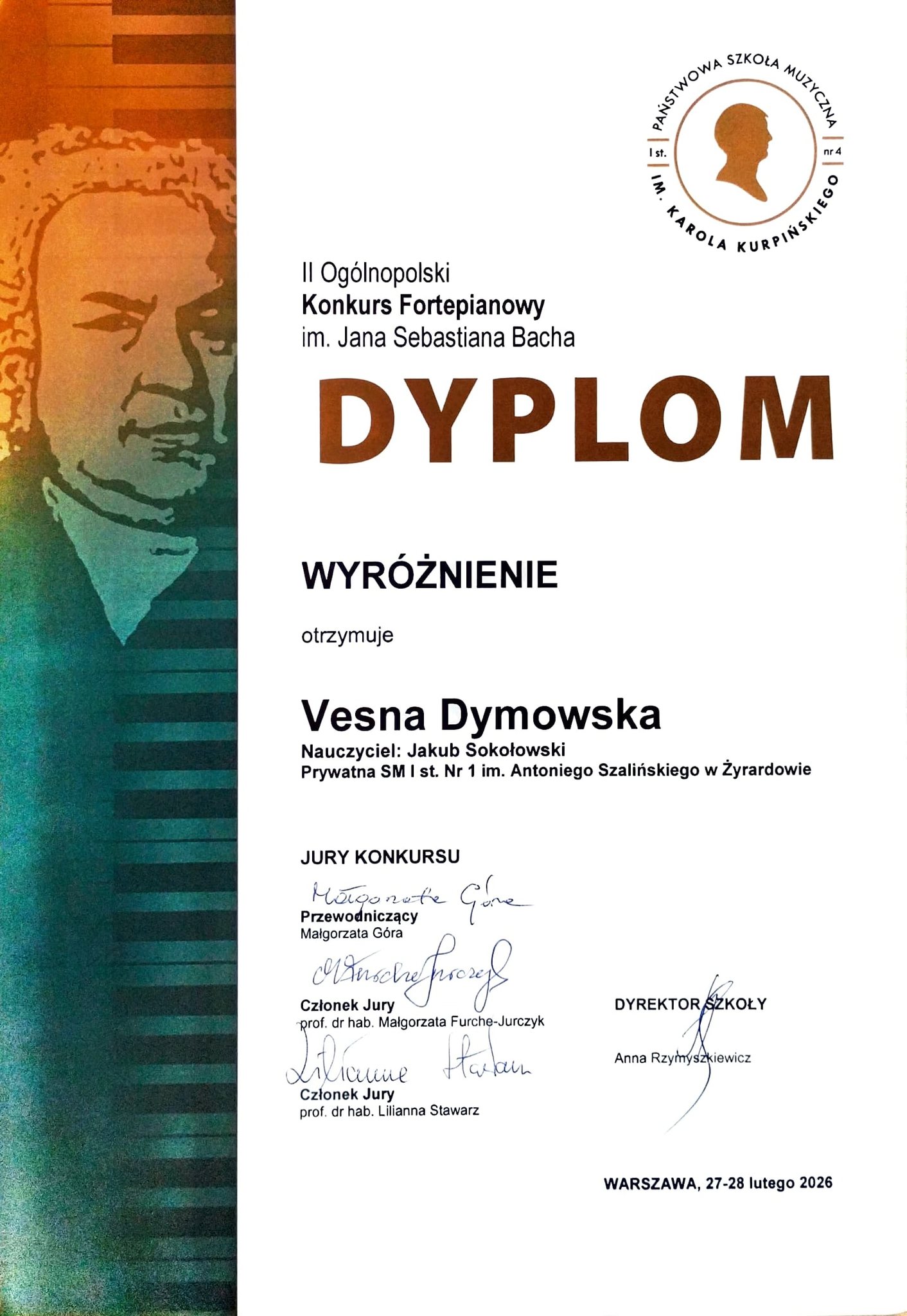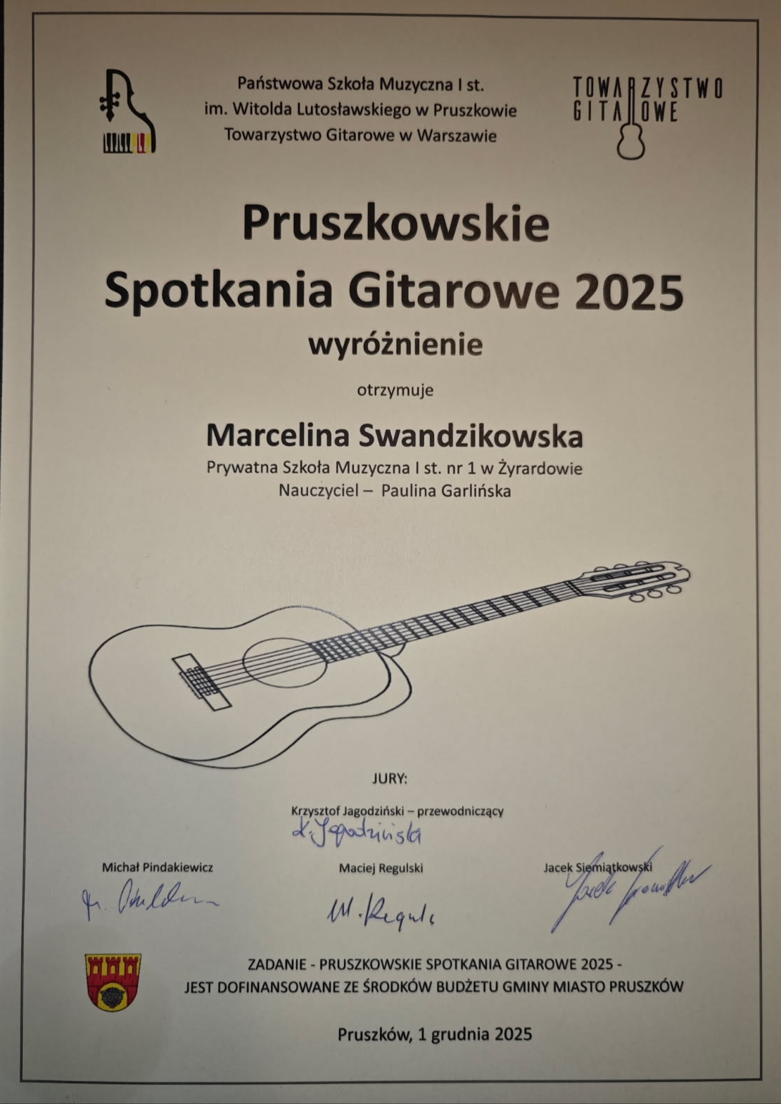 Opublikowane w 12 marca 20269 kwietnia 2026 przez TomekSukcesy naszych uczennic – galeria dyplomów. Z radością prezentujemy tegoroczne sukcesy naszych uczennic podczas: Pruszkowskich Spotkań Gitarowych II Ogólnopolskiego Konkursu im. J.S. Bacha Gratulujemy!!! Serdecznie dziękujemy Nauczycielom, którzy wspaniale przygotowali i wspierali uczennice